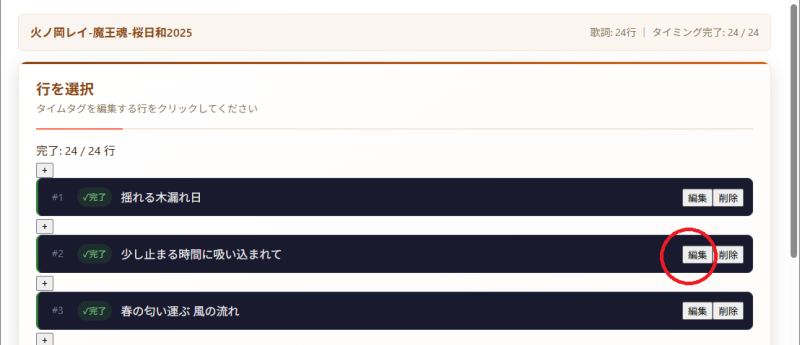 ・タブ「タイムタグ編集」「行を選択」から、2行目の歌詞の「編集」ボタンをクリック