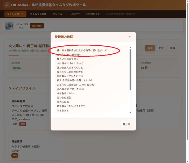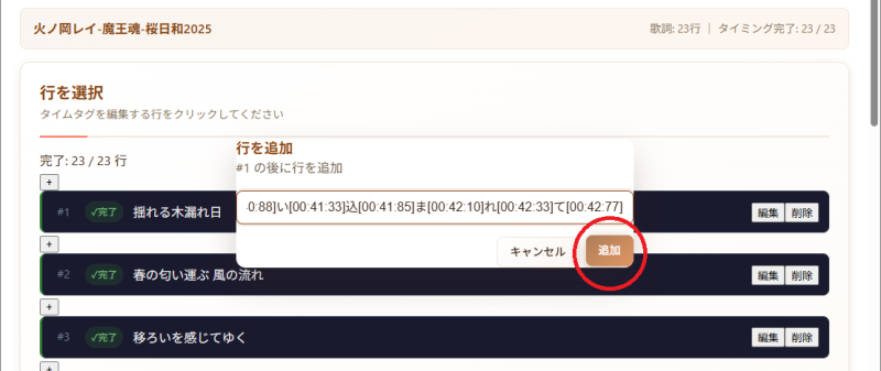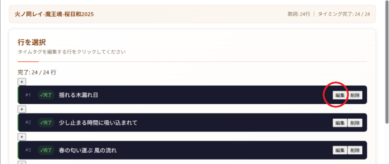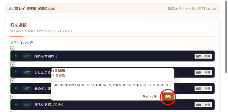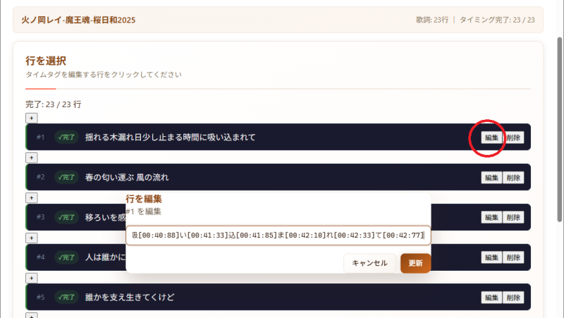 タイムタグを入力した後に、歌詞を編集したい場合は、1行ずつパースされた歌詞データを修正して歌詞を編集します。