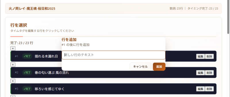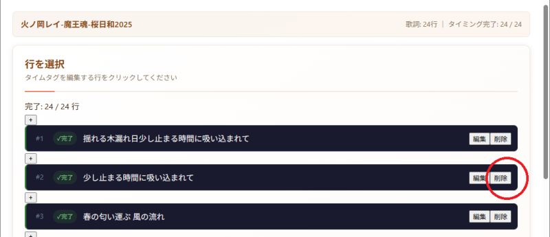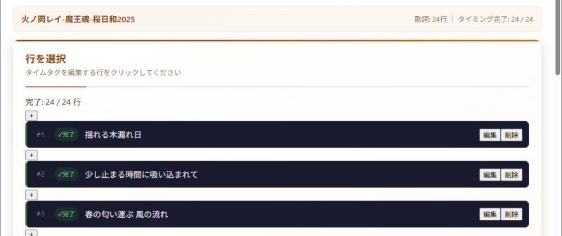タブの「タイムタグ編集」ページに移動すると、1行ずつセグメント化(分割)された歌詞が並んでまして、このデータを編集、削除できます。また行データの追加ができますので、改行の有無をコントロールできます。