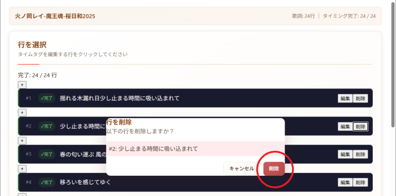 ・不要になった2行目の歌詞を「削除」をクリックしてプロジェクトからデータを削除します。