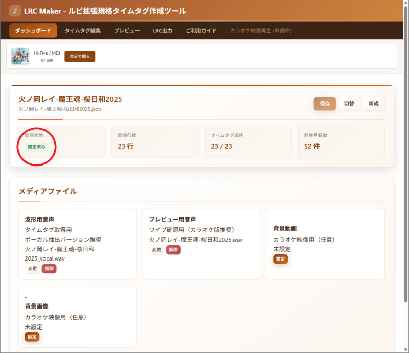 ダッシュボードの「歌詞状態」の「確定済み」をクリック