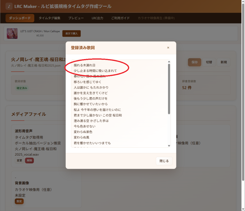 ・1行目の「編集」ボタンをクリックして歌詞データに先ほどコピーした歌詞のLRCデータをペーストし、「更新」でデータを登録します。