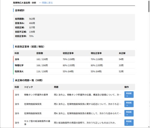 科目別には初回正答率と現在正答率を並べて比較できます。初回と現在の2軸を持たせているのは、最初に間違えた問題を復習で正解に変えた場合の伸びを把握するためです。未正解の問題一覧と除外した問題の一覧も科目別に表示され、未正解の問題は「再挑戦」リンクから直接その問題を開けます。除外した問題は「復帰」ボタンで出題対象に戻せます。